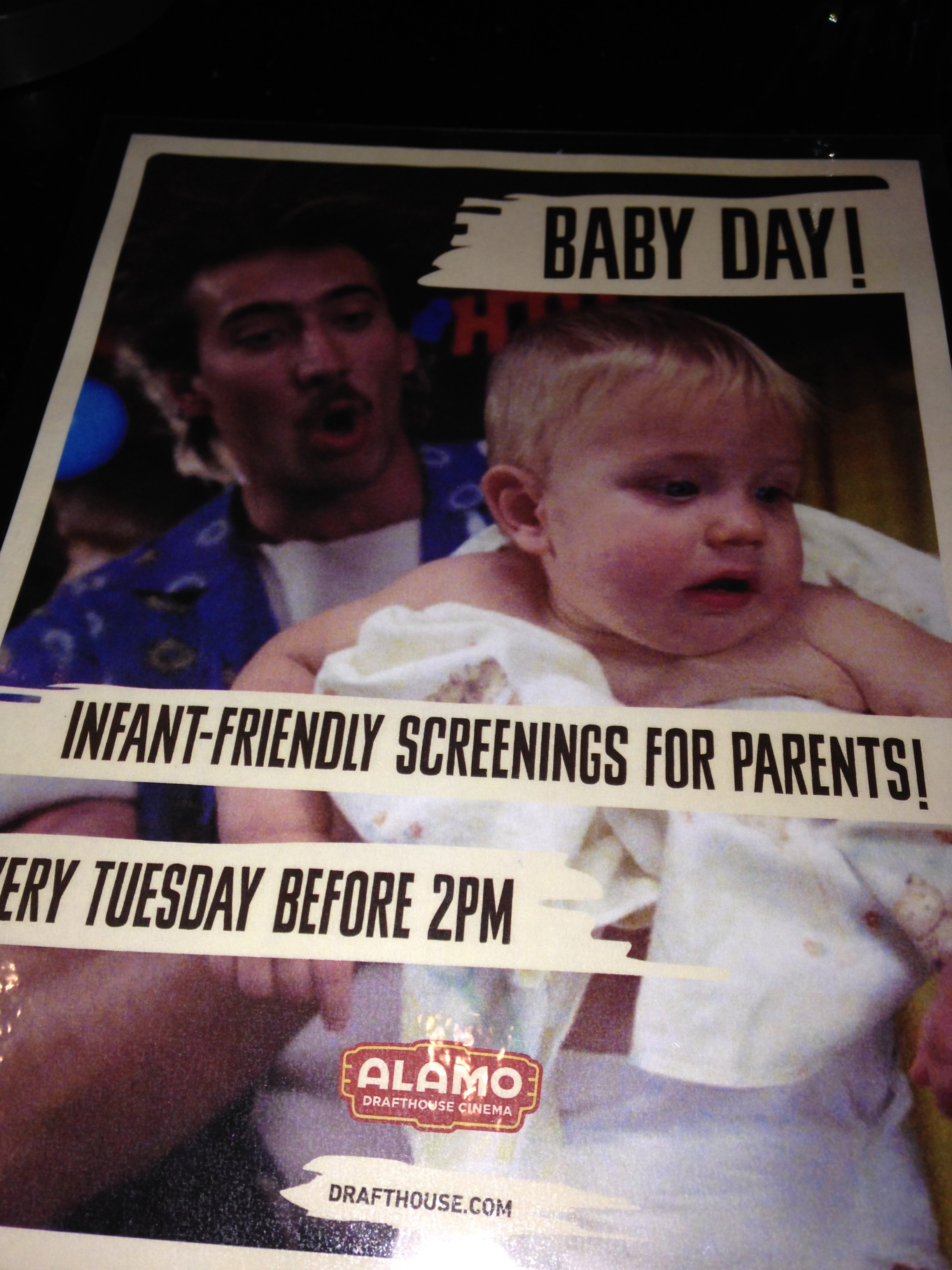 3) Good news for Parents of infants and toddlers. Tuesday is Baby Day! This is a big one for new moms who might be starved for some adult leisure time activities. Grab a few other new moms, bring the babies and toddlers, and come in for a movie and lunch. And what If the baby cries during the movie? No problem! That’s what Baby Day is all about.