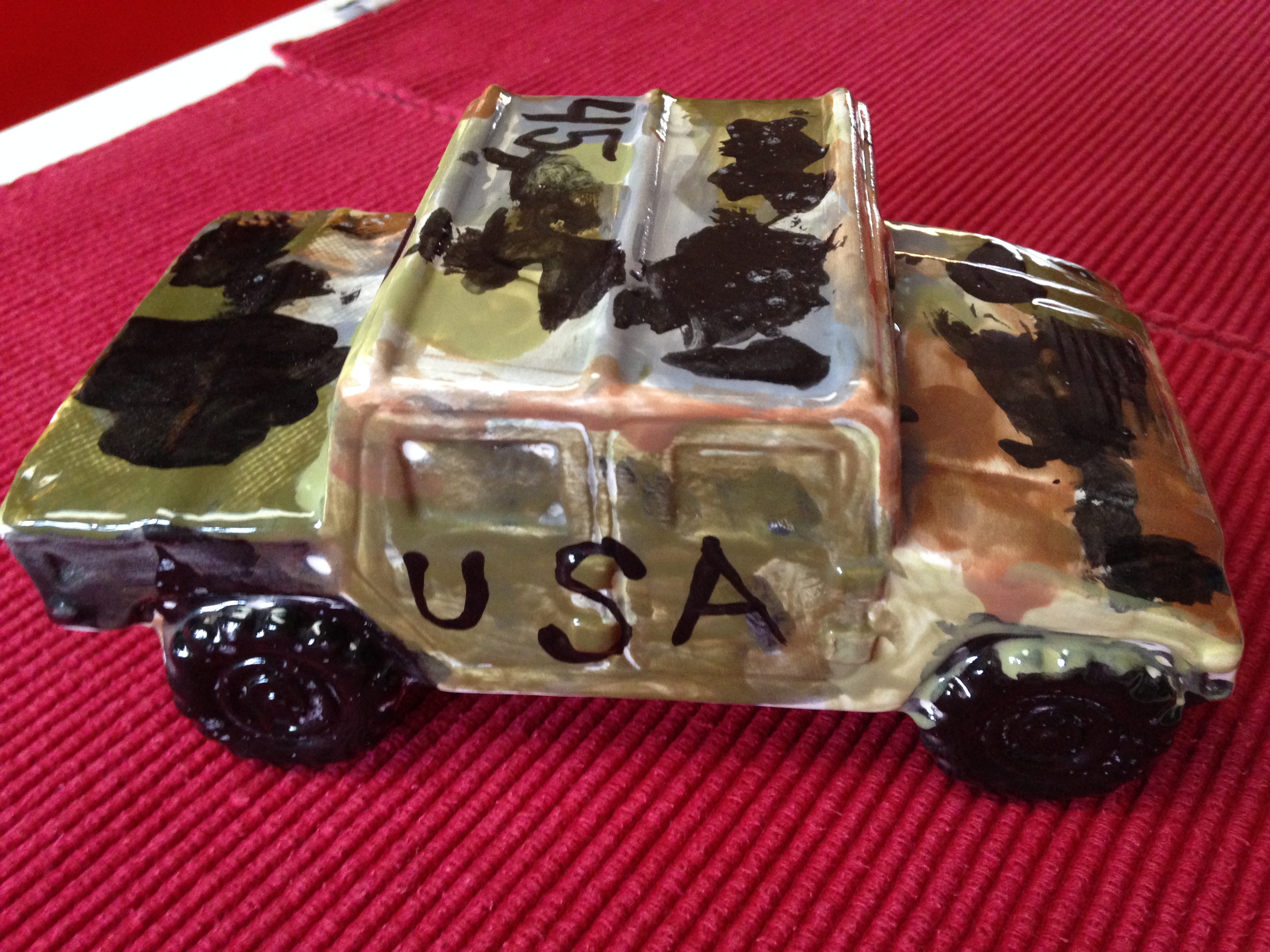 The boys, while initially hesitant to spend the afternoon doing “crafts”, had a great time. My older son was very happy to have a chance to make a hand-made birthday gift for someone special; my younger son was absolutely thrilled to discover pottery pieces designed JUST for him! Trucks and cammo, anyone?